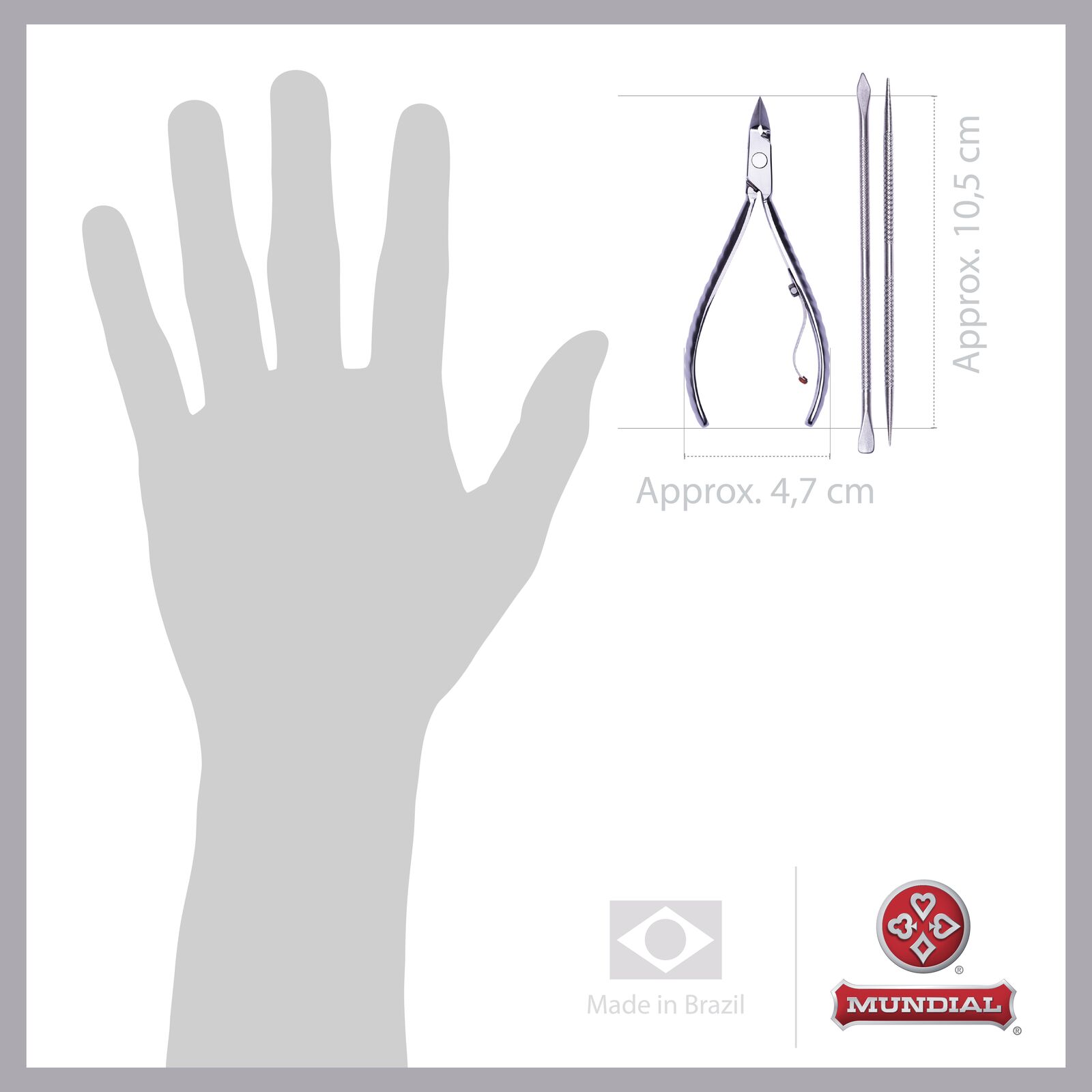 778-EP | MUNDIAL - 0700 Series, 'Professional', cuticle nipper, nail care set, regular straight edge, regular size tip, stainless steel, fully nickel-plated, fully forged, set containing: (1) Cuticle Nipper (778), (1) Duplex (Cuticle Pusher & Scraper), (1) Manicure Stick, Made in Brazil, single piece, packed in a full double blister packaging
